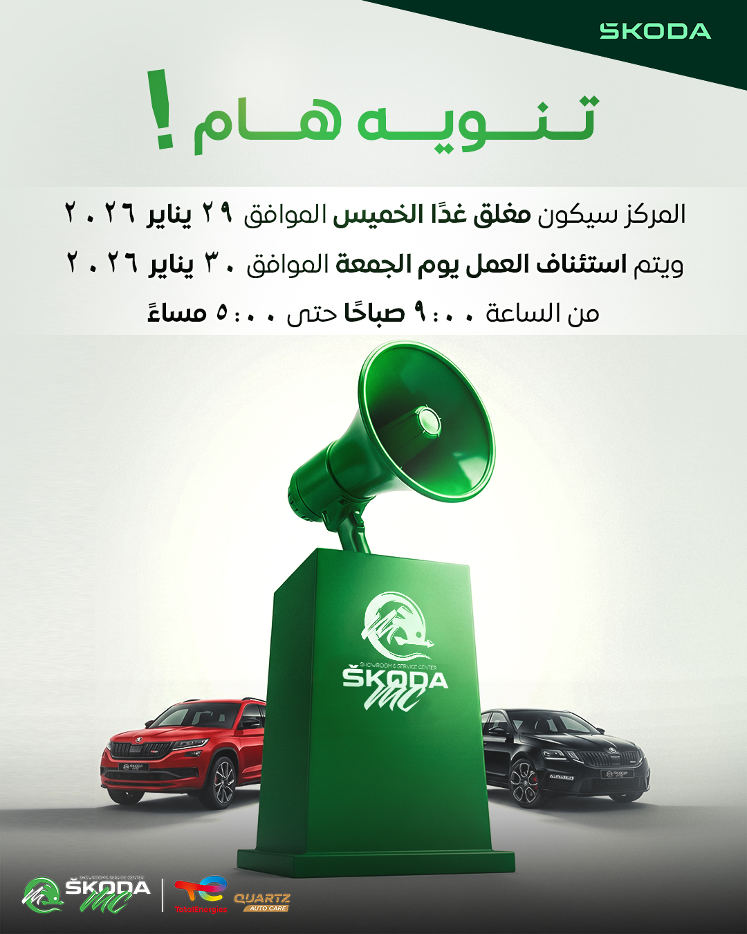 تنويه هام📣 المركز سيكون مغلق غدًا الخميس الموافق 29 يناير 2026 ويتم استئناف العمل يوم الجمعة الموافق 30 يناير 2026 من الساعة 9:00 صباحًا حتى 5:00 مساءً كل عام وأنتم بخير ❤️ سكودا معادي سنتر.. مركز الثقة